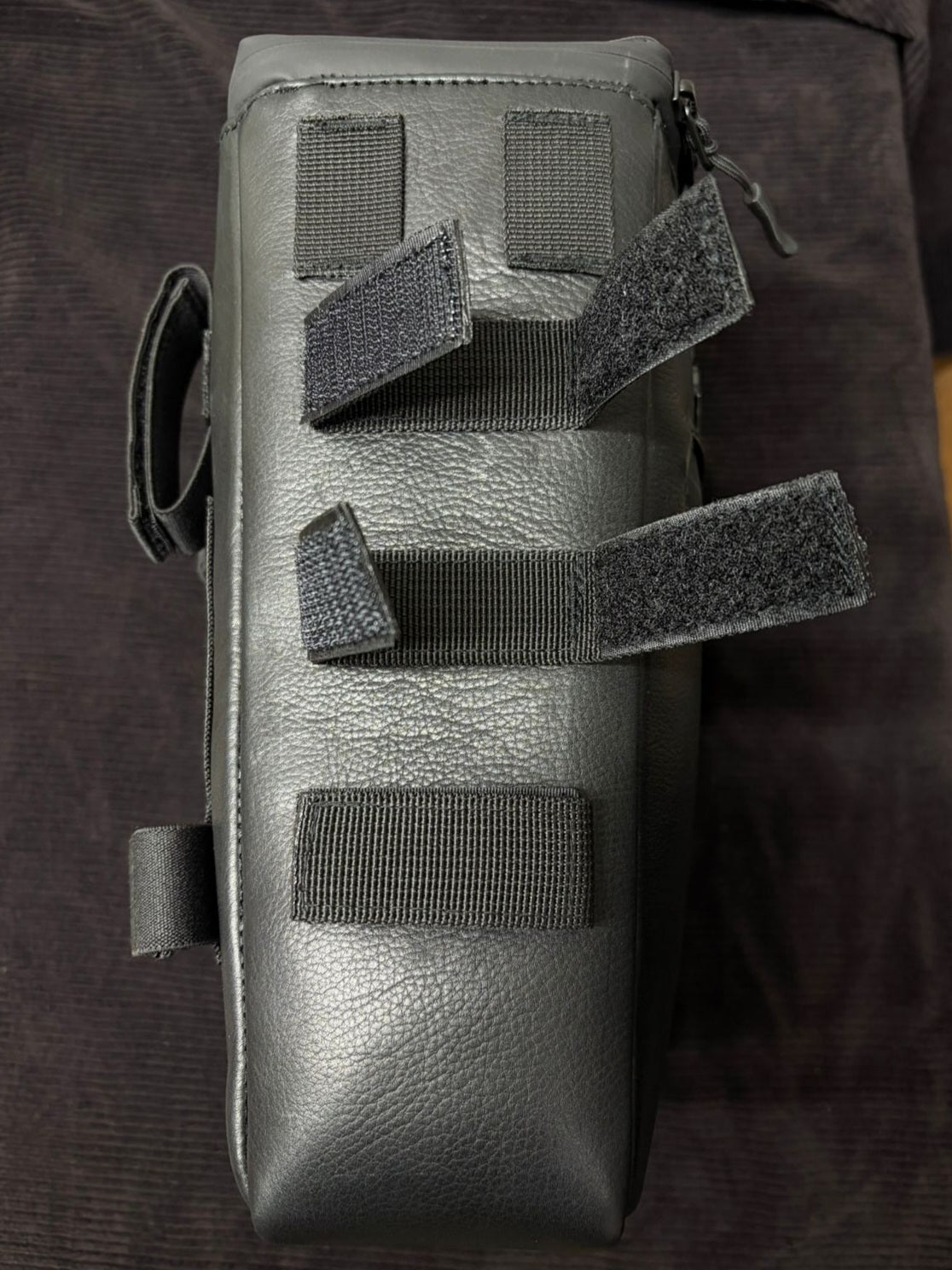 Full leather bar bags thar measure 11" x 7 ". They feature a tall can pouch on one side, and straps to hold a large maglite on the other side for..." safety" or whatever.